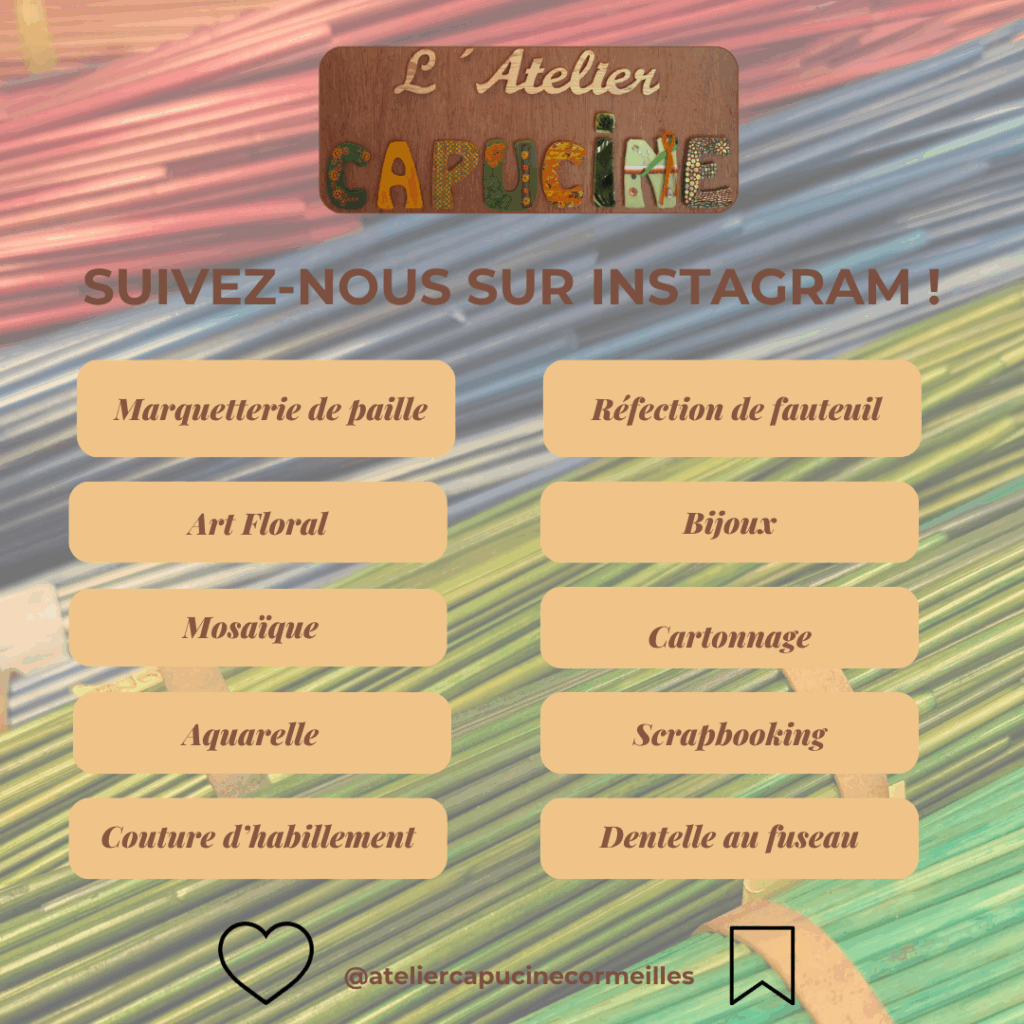 Super nouvelle pour 2025, Capucine fait ses premiers pas sur Instagram ! N’hésitez pas à vous abonner à notre page pour partager la vie de l’association, suivre les actus des cours et stages, découvrir les dernières réalisations. Retrouvez-nous ici : https://www.instagram.com/ateliercapucinecormeilles